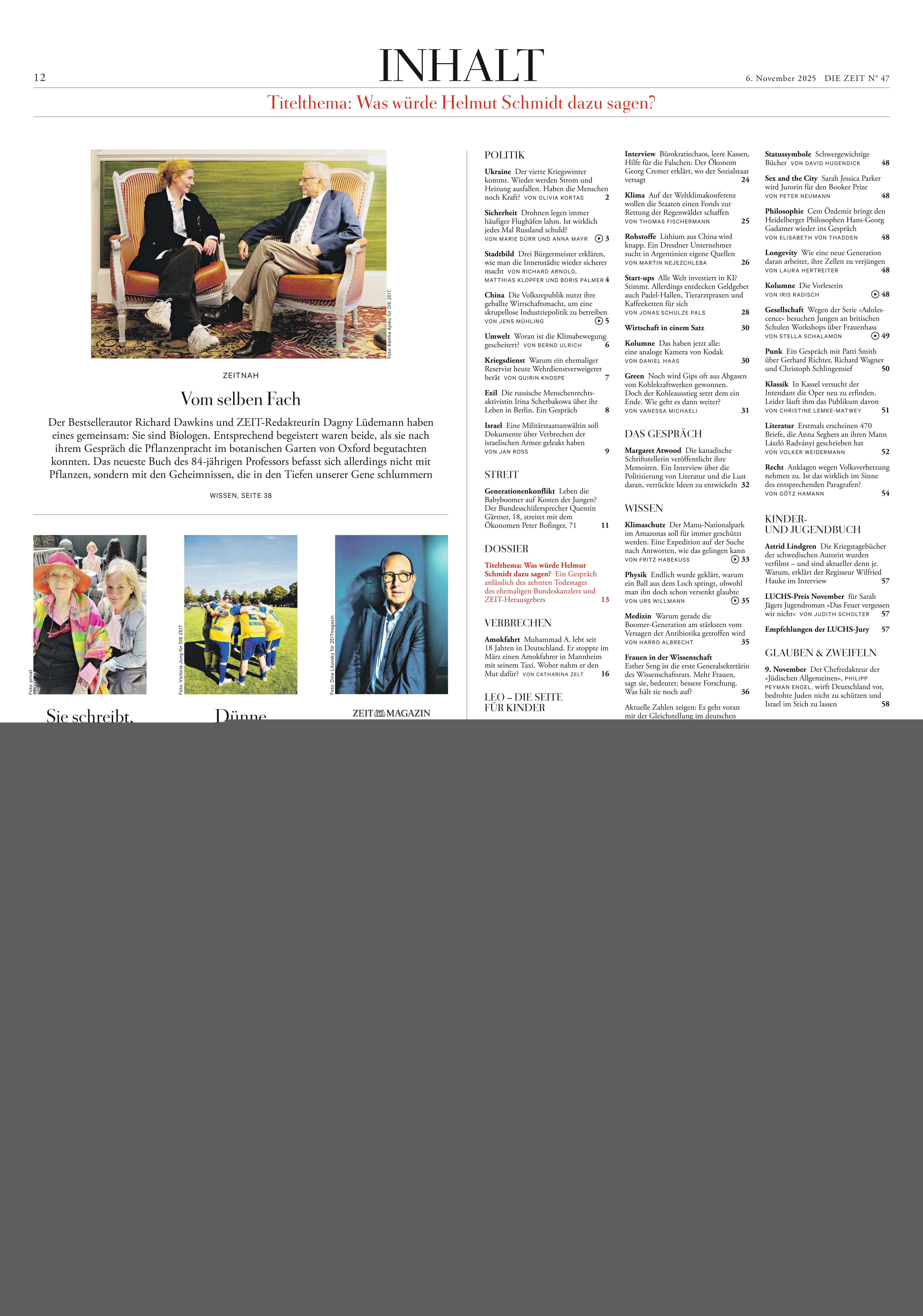 Titelthema: Was würde Helmut Schmidt dazu sagen? Vielen Menschen fehlt er als moralischer und politischer Kompass, auch zehn Jahre nach seinem Tod. Vier Wegbegleiter – Sandra Maischberger, Peer Steinbrück, Thomas Karlauf und Giovanni di Lorenzo – diskutieren, wie er heute wohl auf die Welt blicken würde