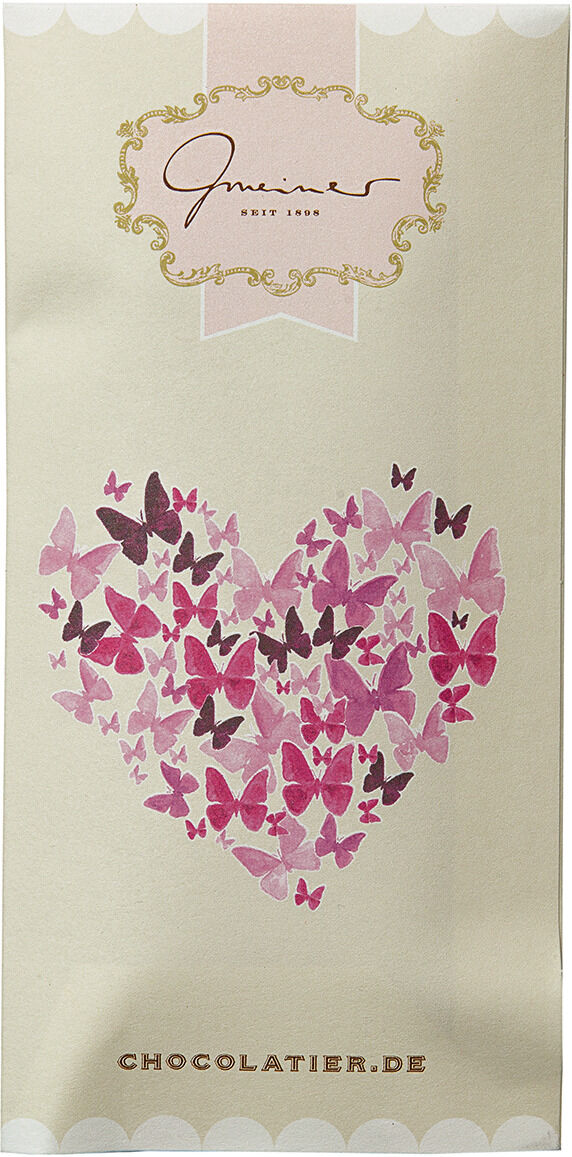 Tafelschokolade: Hausgemachte Vollmilchschokoladetafel mit mind. 40 % Kakao. Liebevoll verpackt in Papier mit Schmetterlings-Motiv.