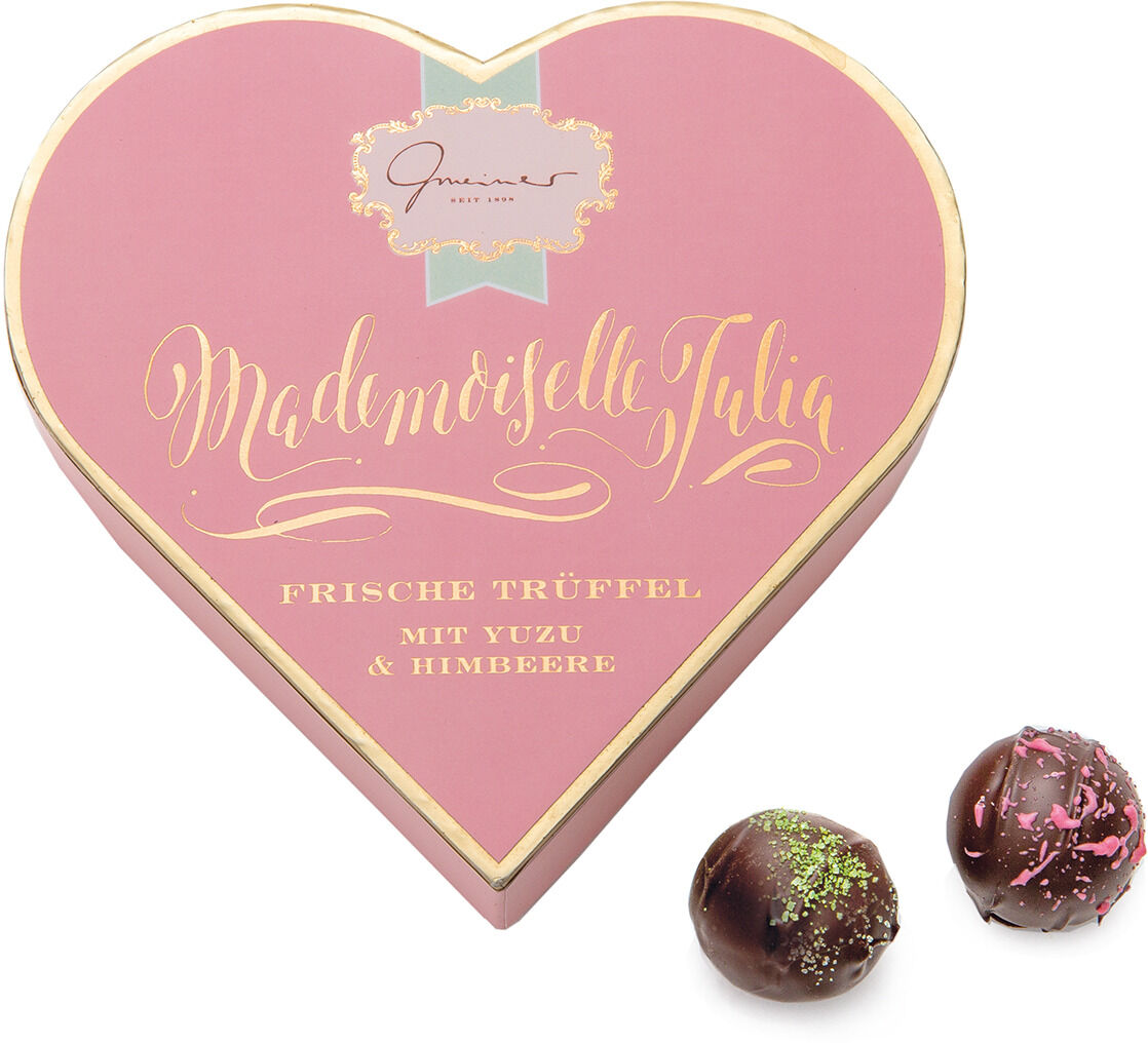 »Mademoiselle Julia«: Entdecken Sie die Lieblingstrüffel der Tochter des Hauses mit Namen Julia. Diese delikaten Schokoladenkreationen werden aus feinsten südamerikanischen Kakaobohnen (64 % Venezuela) hergestellt und mit frischen Himbeeren oder Yuzufrüchten verfeinert. Die dunkle Ganache verleiht den Trüffeln einen intensiven Geschmack, der von den fruchtigen Aromen perfekt ergänzt wird. Ein unwiderstehliches Vergnügen für jeden Schokoladenliebhaber!