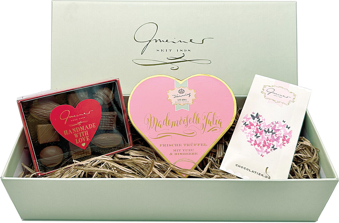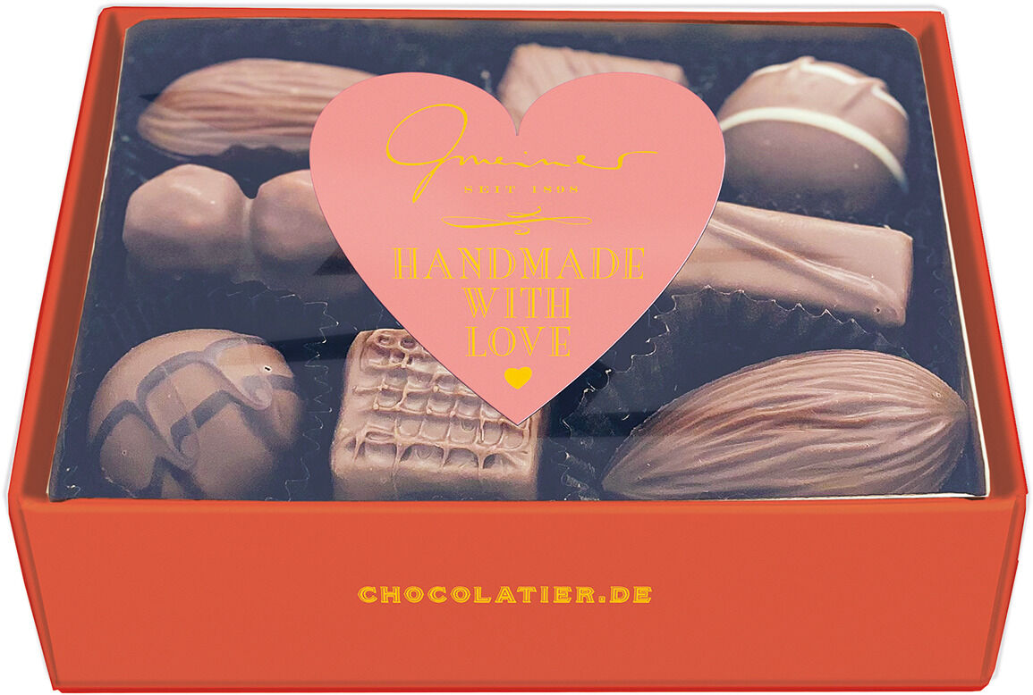 »Handmade with Love« Pralinen: Entdecken Sie die feinste Pralinenspezialität als Vollmilchvariation bester handgefertigter Gmeiner-Pralinen ohne Alkohol. Jede Praline wurde sorgfältig von Hand gefertigt und mit einer Prise Liebe verfeinert. Die Verwendung der besten Zutaten garantiert ein einzigartiges Geschmackserlebnis.
