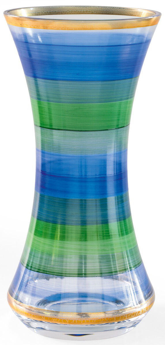 Die kunstvolle Farbgebung entsteht durch das Aufbringen von Farbpulver auf die flächig bemalte Vase und verleiht jedem Stück einen individuellen Charakter. Ein Hauch von Luxus wird durch die abschließende Veredelung mit echtem Glanzgold hinzugefügt, wodurch die Vase zu einem außergewöhnlichen Dekorationsobjekt wird.