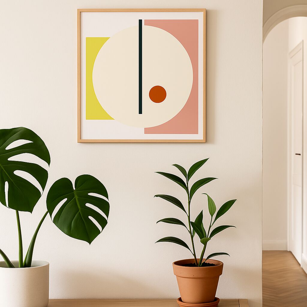 Ein besonderes Designelement ist der Schattenfugenrahmen aus naturbelassener Eiche. Zwischen Bildträger und Rahmen verbleibt ein umlaufender Spalt von etwa einem Zentimeter, der den Eindruck erweckt, das Kunstwerk würde frei im Rahmen schweben. Diese Präsentationsweise verleiht dem Bild Tiefe und unterstreicht seinen modernen Galeriecharakter – dezent, hochwertig und zeitlos schön.