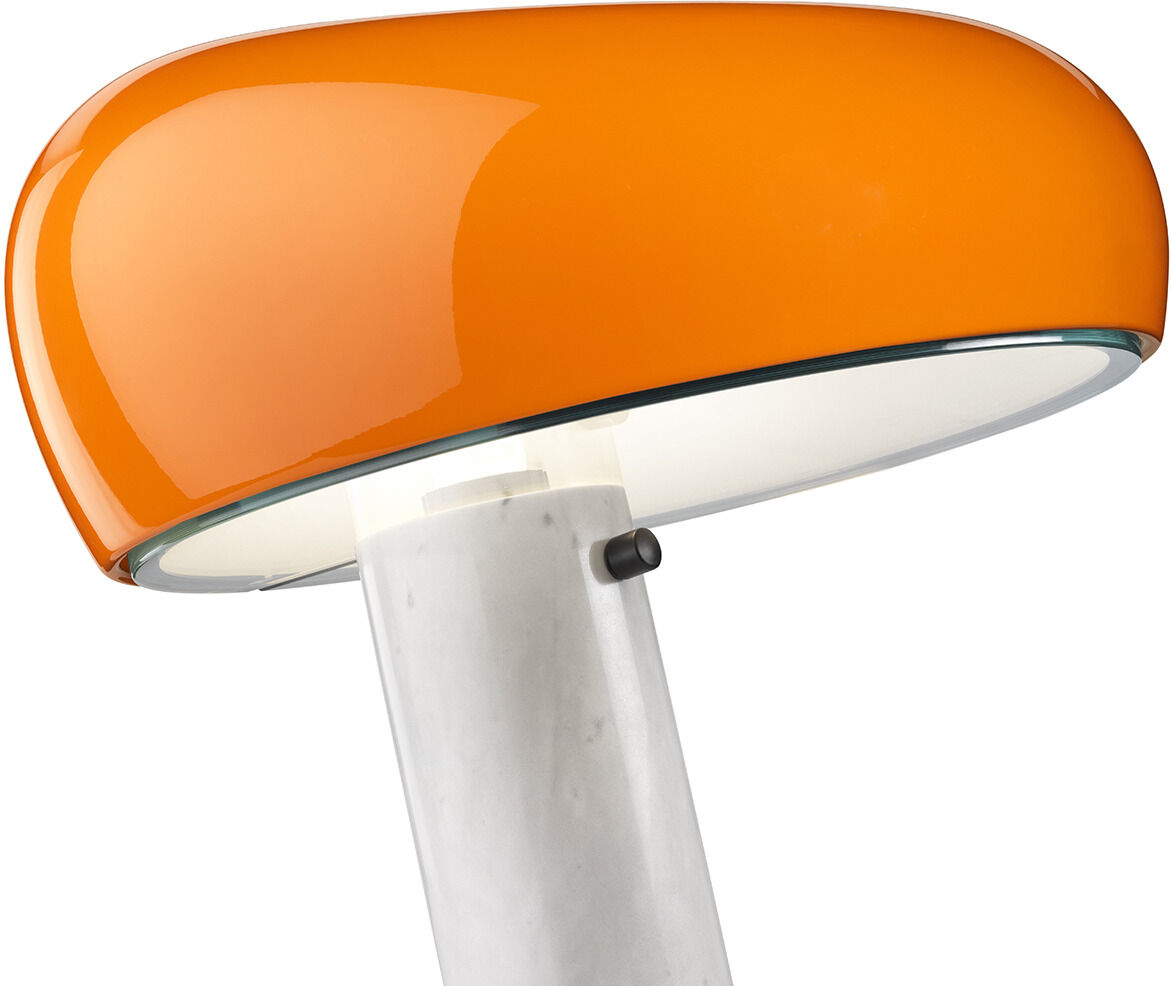 Auffällig sind die drei Lüftungsöffnungen an der Oberseite, die an eine Bowlingkugel erinnern und der Lampe eine besondere Note verleihen. Die Basis besteht aus hochwertigem Marmor und ist mit einem Touch-Sensor ausgestattet, der eine stufenlose Anpassung der Lichtstärke ermöglicht, um das Ambiente individuell zu gestalten. Die Snoppy Lampe verfügt über eine E27-Fassung, wird jedoch standardmäßig ohne Leuchtmittel geliefert. Die Snoopy Lampe wird von der renommierten Marke FLOS in Italien gefertigt.