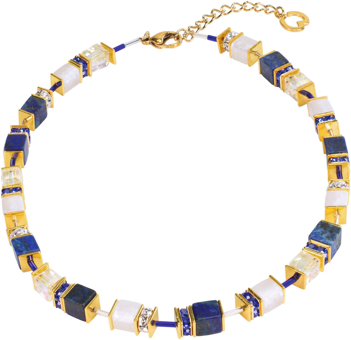 Ein elegantes Spiel aus Licht und Farbe: Das Collier »Daylight« von Petra Waszak vereint tiefblaue Lapislazuli-Kuben mit schimmernden perlmuttfarbenen Muranoglas-Elementen und facettierten Kristallen. Die Reflexe der feinen Facetten und der 24 Karat vergoldeten Messingplättchen erinnern an Sonnenstrahlen, die durch die Wolken brechen.