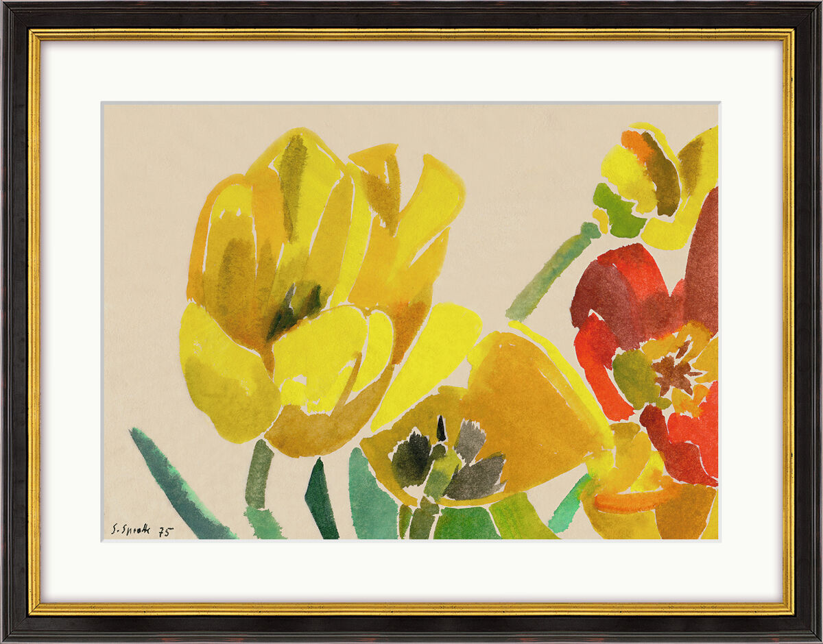 Siegward Sprottes Werk »Im Garten meiner Mutter II« (1975) besticht durch seine poetische Leichtigkeit und die harmonische Farbgebung. Mit dynamischen Pinselstrichen und reduziertem Ausdruck fängt er die Essenz der Natur ein und schafft eine meditative Bildkomposition.