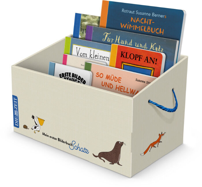 Die ZEIT-Edition »Mein erster Bilderbuchschatz« bereichert Kinder von Geburt an und wird sie lange begleiten. Bekannte Klassiker, die in keinem Bilderbuchregal fehlen dürfen, sind ebenso enthalten wie neu entdeckte Perlen. So lädt das interaktive Bilderbuch »Klopf an« zum festen Anklopfen auf den stabilen Pappseiten ein: Was wartet wohl hinter der Tür? Die Schöpfer des weltberühmten Grüffelo entführen in »Für Hund und Katz ist auch noch Platz« in die Welt von Hexen und Drachen und im »Nacht-Wimmelbuch« von Rotraut Susanne Berner dürfen die wuseligen Bilder nach unzähligen Details durchsucht werden.