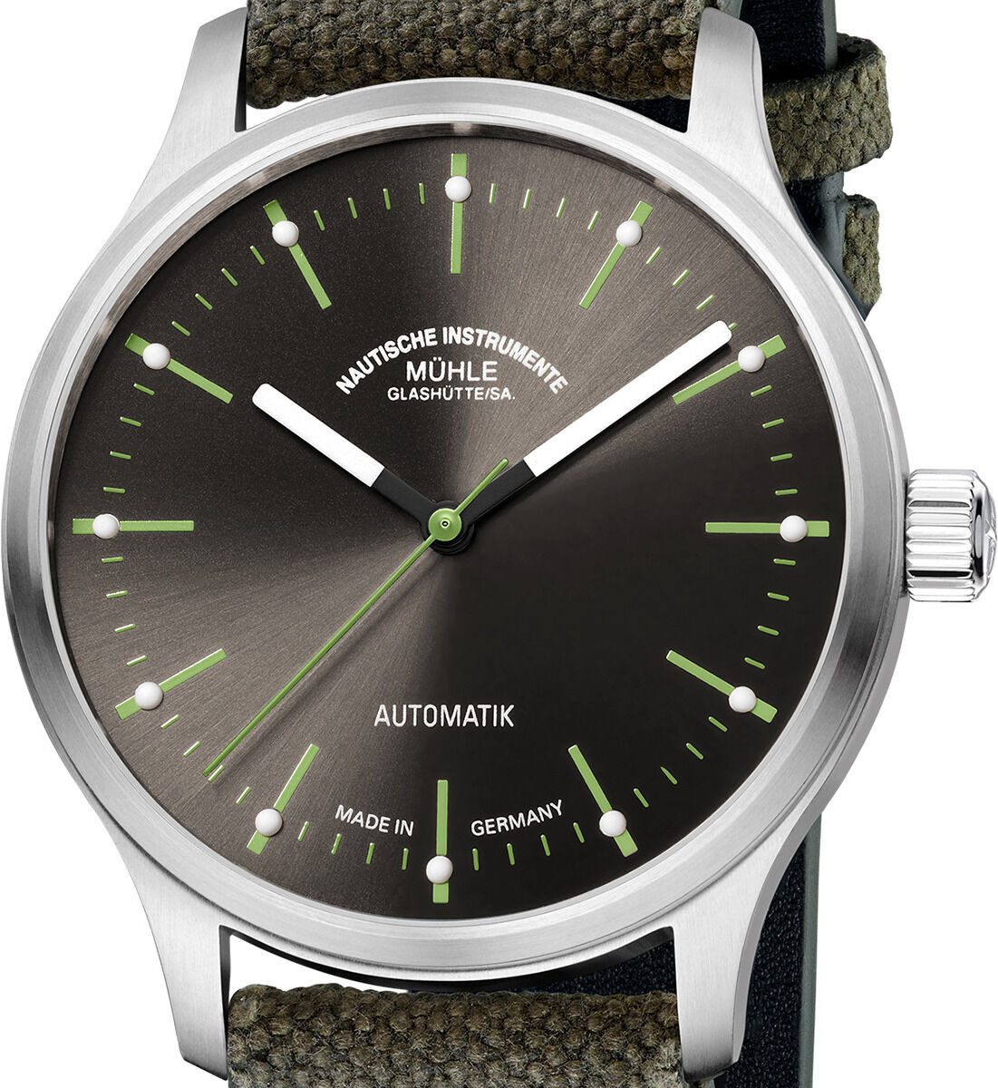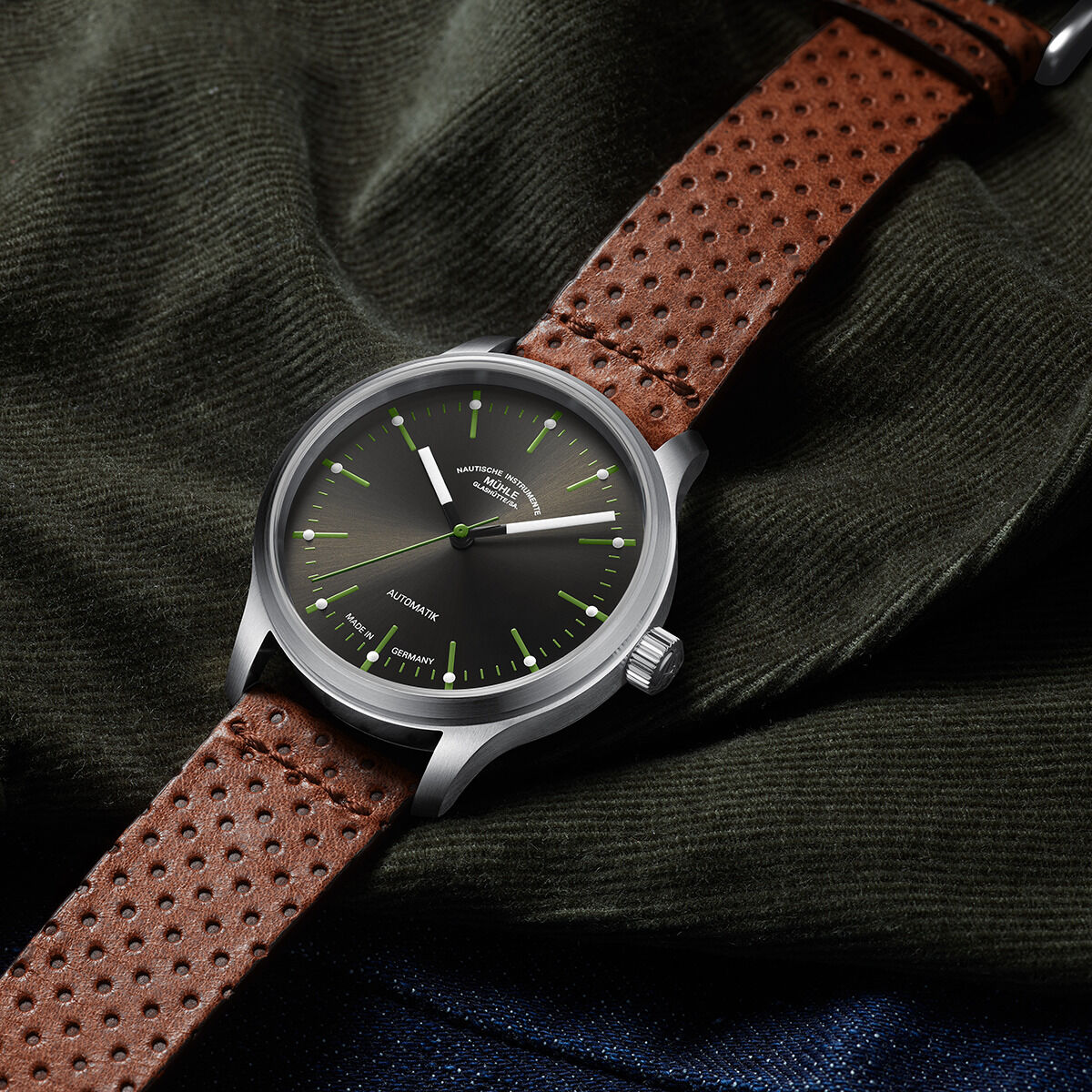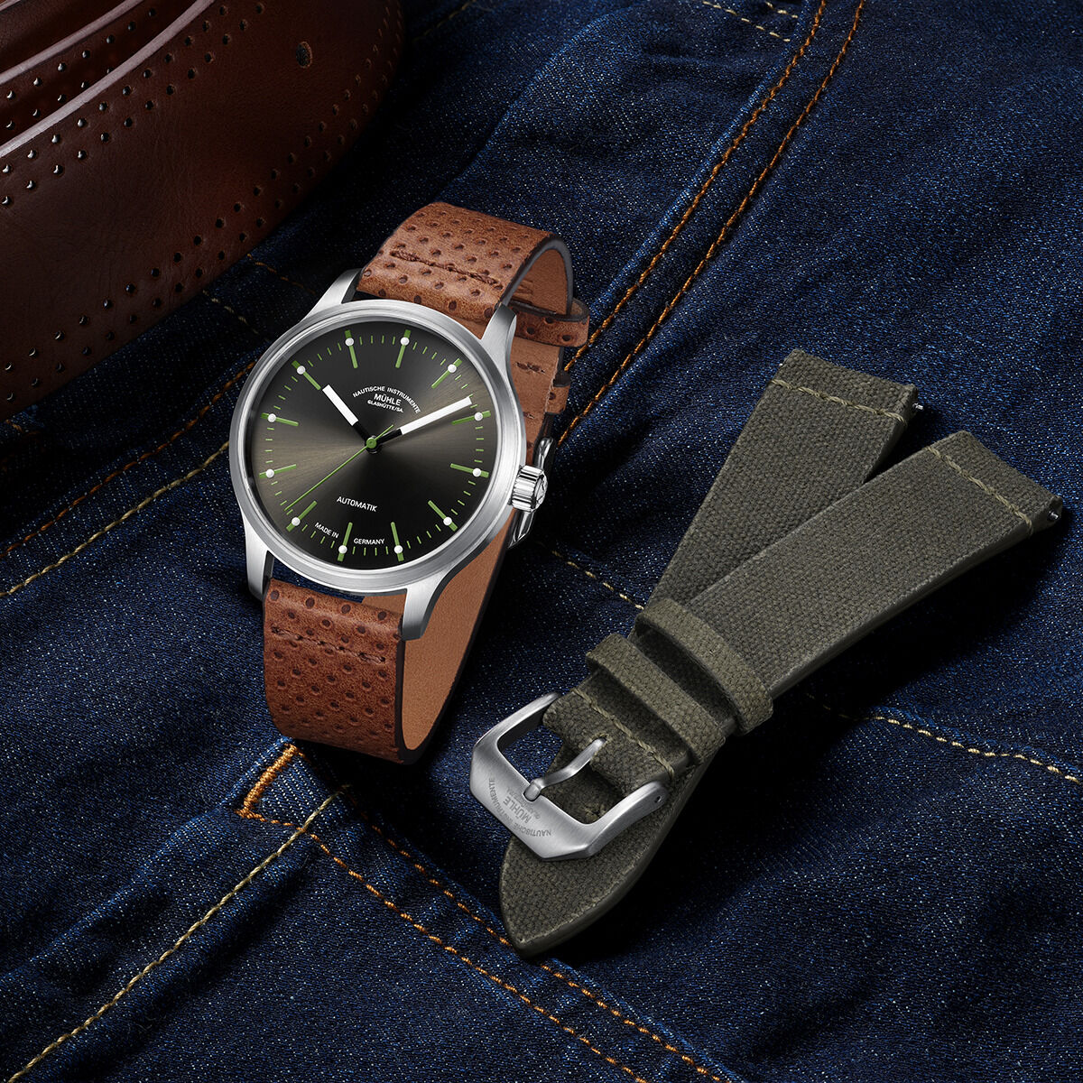 Sie erhalten zwei Armbändern die unterschiedlicher nicht sein könnten aber perfekt zur Armbanduhr passen. Das braune Lederarmband sowie das grüne Canvasarmband verändern das Gesamtbild des Mühle-Zeitmessern und stehen jeweils für Eleganz, Understatement und handwerkliche Präzision.