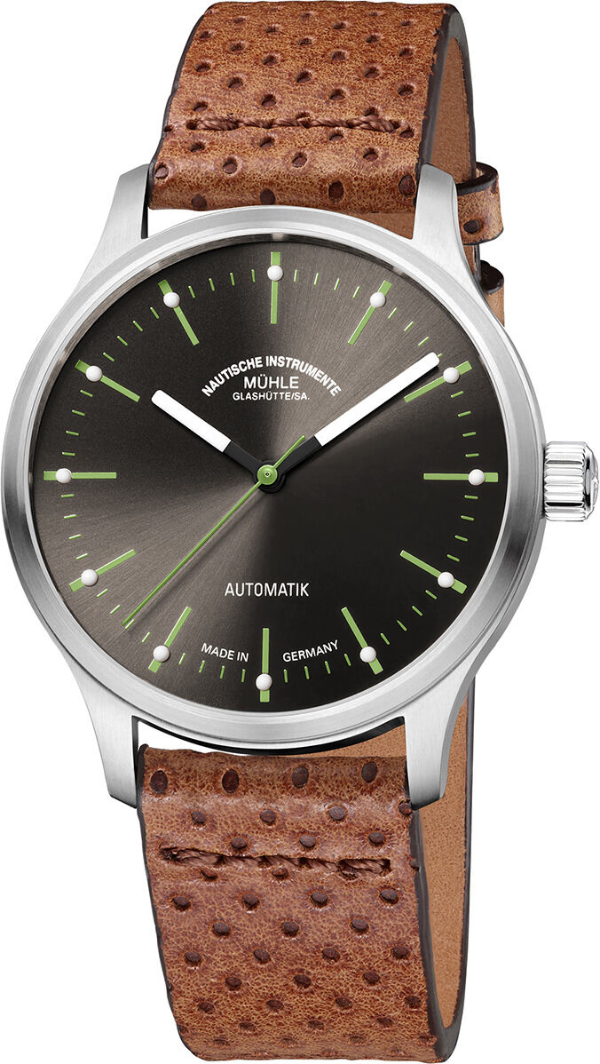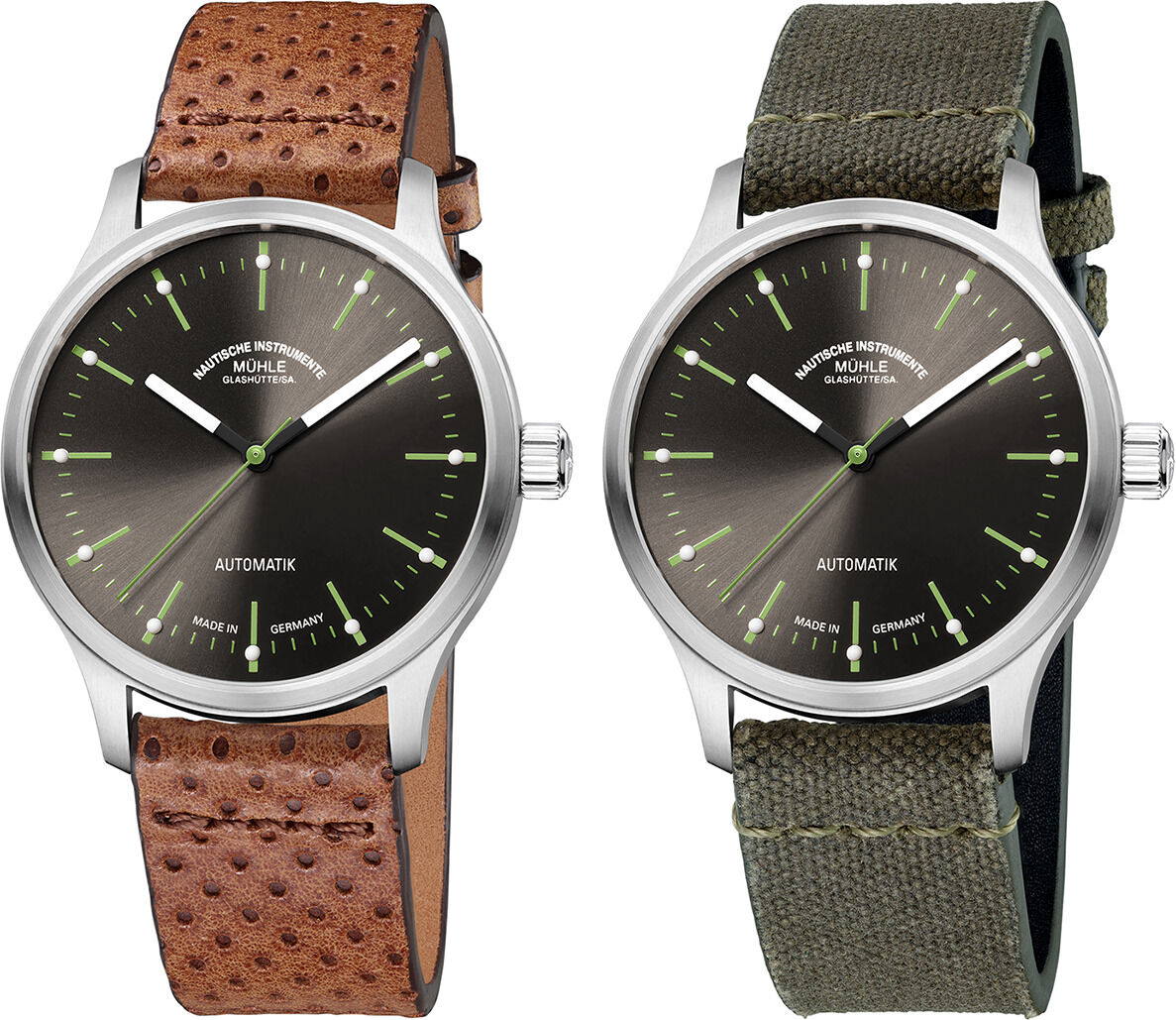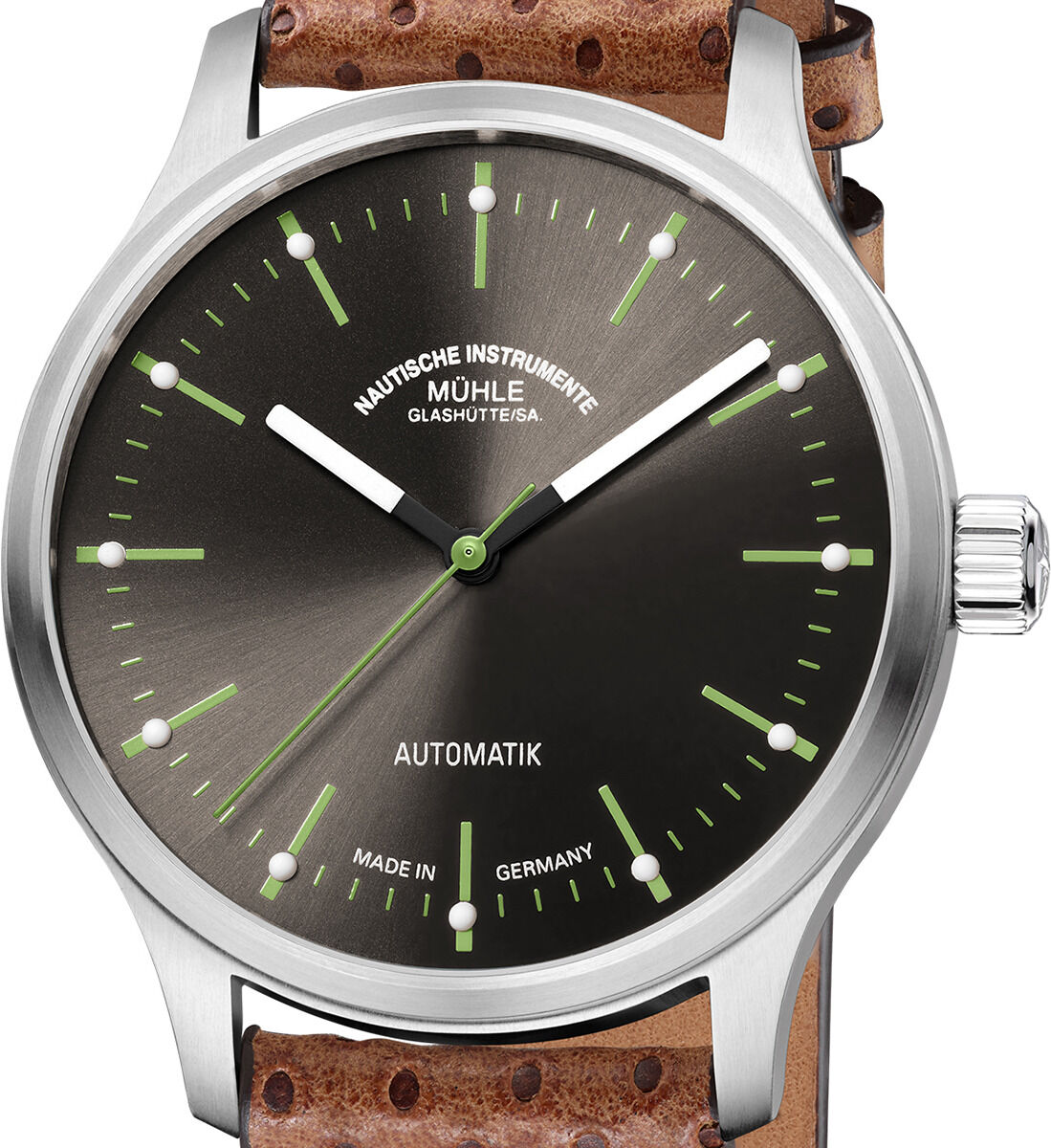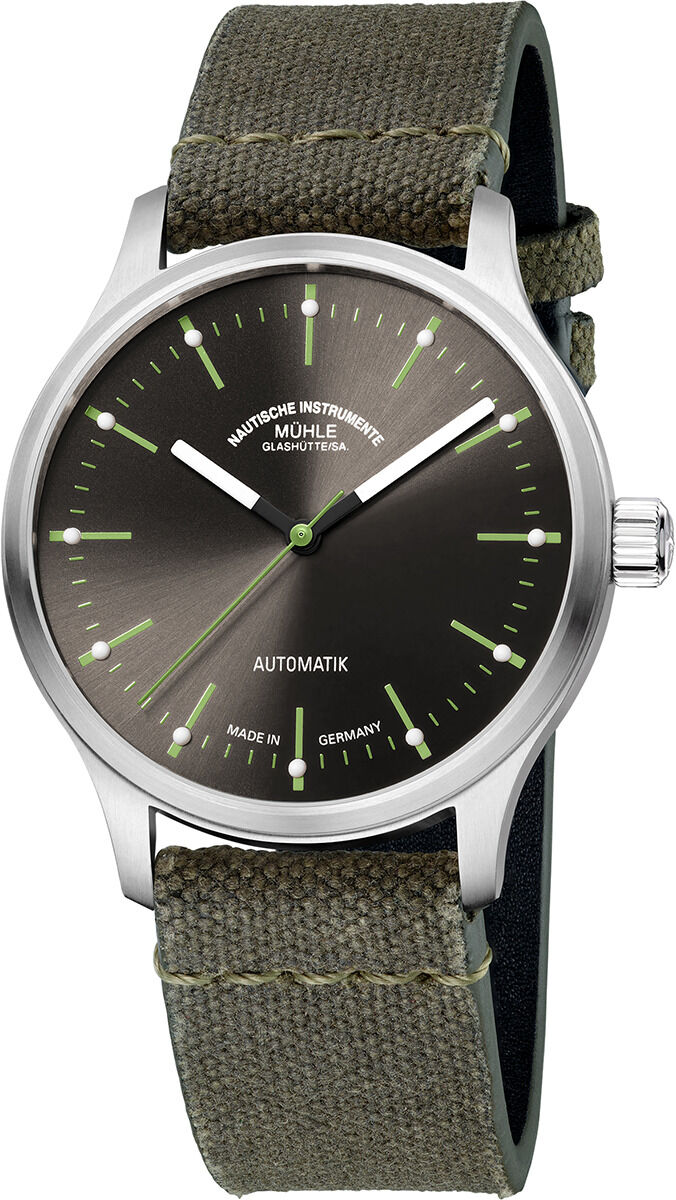 Sie erhalten zwei Armbändern die unterschiedlicher nicht sein könnten aber perfekt zur Armbanduhr passen. Das braune Lederarmband sowie das grüne Canvasarmband verändern das Gesamtbild des Mühle-Zeitmessern und stehen jeweils für Eleganz, Understatement und handwerkliche Präzision.